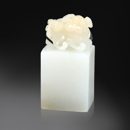 這枚白玉貔貅印章質(zhì)地溫潤細(xì)膩,手感極佳。瑞獸為鈕,牛蹄形足,寬長獅形尾。回首狀,雙眼圓睜,剛勁威猛,上身有糖色,寓意鴻運(yùn)當(dāng)頭,這種取用俏色的方法現(xiàn)代而唯美,適宜作辟邪旺財(cái)之隨身攜物。