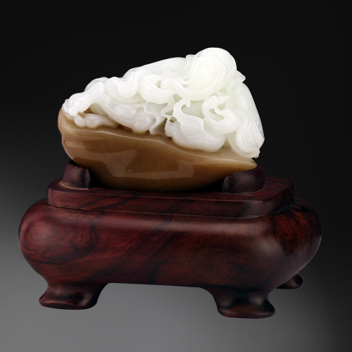顏色潔白,質(zhì)地細(xì)膩,油潤度極佳,手感溫潤順滑。王羲之是晉代書法家,從家鵝游水中悟出用筆之法,于是養(yǎng)成愛鵝之癖。作品中王羲之閑適而臥,撫須出神,若有所思,白鵝展翅望向王羲之,動靜皆宜,惟妙惟肖。