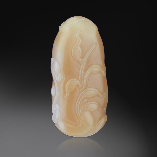 溫潤細膩的玉質大部分被糖色包裹,更顯白玉的潤白,色彩的融合相得益彰。側面白色雕琢如意,正面高浮雕茁壯成長的幼嫩青竹,構圖完整,枝葉工藝細膩。竹節是權利、地位、身份的象征,代表著高風亮節、前程似錦、節節高升,步步高升之意。