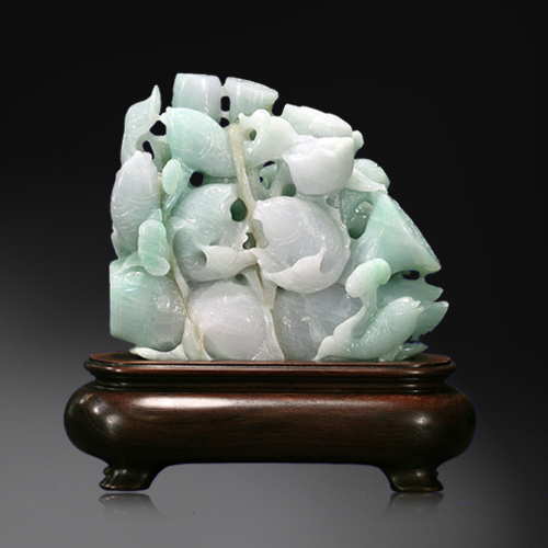 作品構思巧妙,運用圓雕、浮雕、俏色雕,采用寫實手法,鯉魚躍然而起于荷葉之間,極具動感,工藝細膩,構圖完整,分色清楚,形象生動,美觀逼真,喜慶之意呼之欲出。 “魚”與“余”諧音,象征吉慶有余、連年有余。